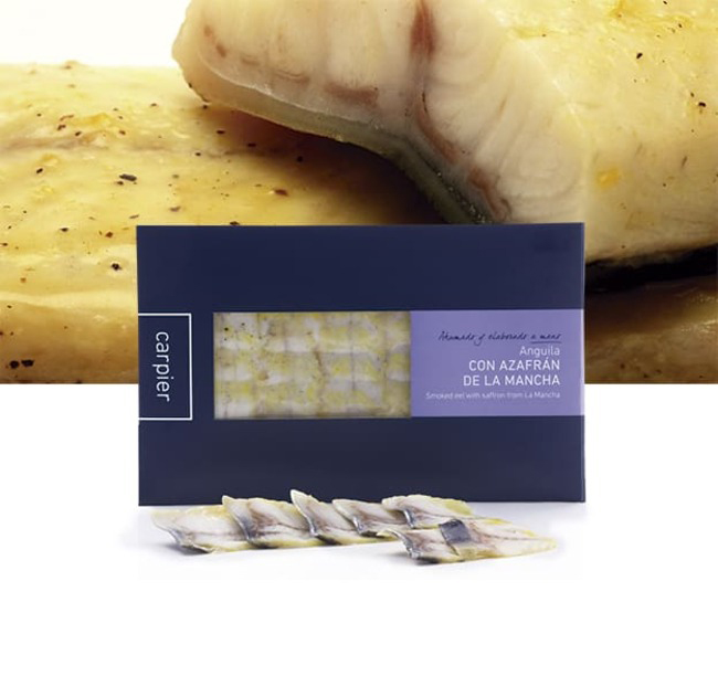Anguila ahumada con azafrán de La Mancha al corte tradicional