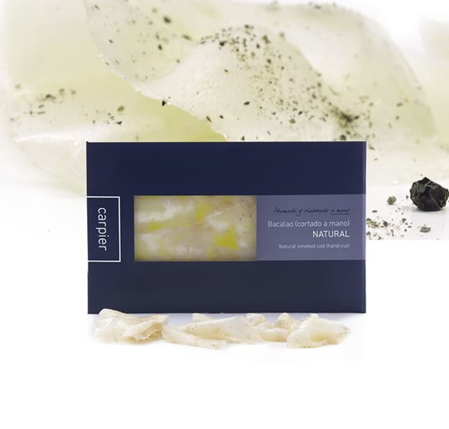 Características: Lonchas de bacalao salvaje de más de 8 kg procedente de Islandia, Noruega y Dinamarca. Se recomienda degustar solo como aperitivo o con las tostas ahumadas.