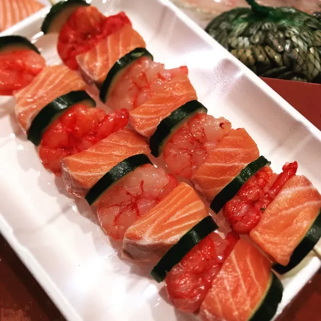 Brochetas de salmón ecológico Premium con gamba pelada de Palamós.