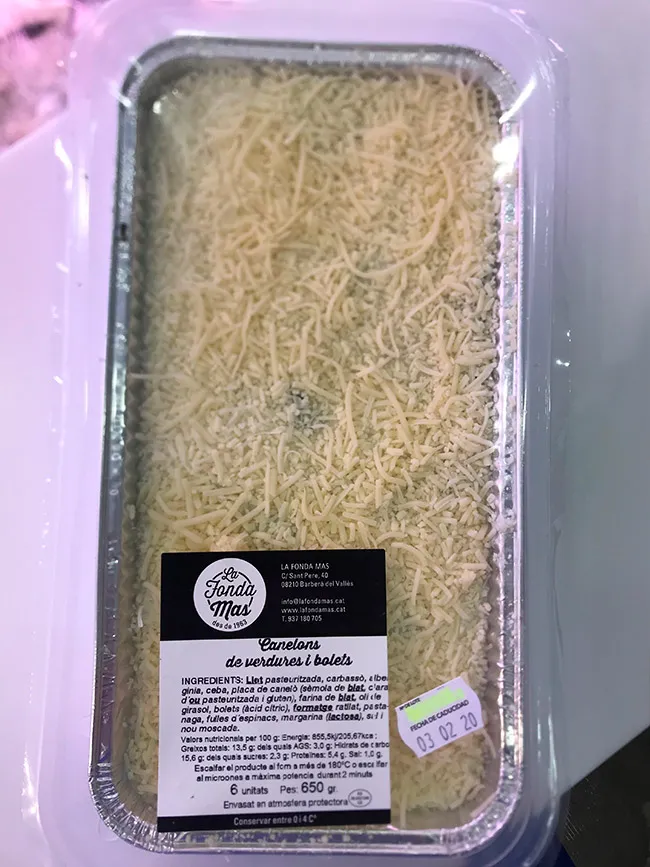 INGREDIENTES: Leche pasteurizada, calabacín, berenjena, cebolla, placa de canelón (sémola de trigo, clara de huevo pasteurizada y gluten), harina de trigo, aceite de girasol, setas (ácido cítrico), queso rallado, zanahoria, hojas de espinacas, margarina (lactosa), sal y nuez moscada.