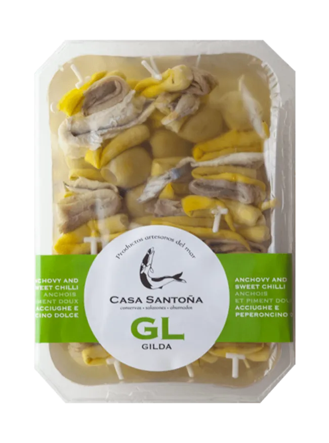 La banderilla artesana definitiva: anchoa premium, guindilla y aceite. El aperitivo clásico listo para servir.