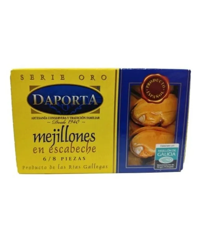 Mejillones gallegos seleccionados (8/10 piezas) en escabeche premium. Tamaño extra y textura carnosa inmejorable.