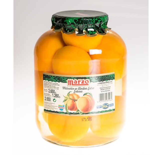 Ingredientes: Melocotón, agua. azúcar, acidulzante: ácido cítrico, antioxidante: ácido ascórbico y endurecedor: E-509.