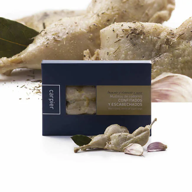 Características: muslos de codorniz procedentes de las comarcas de Lleida, ahumados, macerados, escabechados y confitados. Se recomienda comer calentado al baño María durante 5 minutos