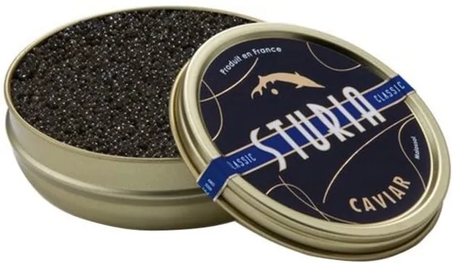Caviar Sturia Baerii francés, curado hasta 6 meses. Producido cerca de Burdeos en piscinas naturales con esturiones criados de forma sostenible. Textura delicada, sabor intenso y elegante.
